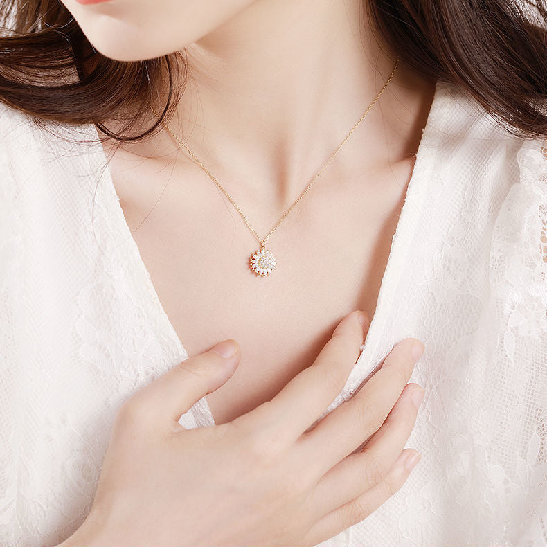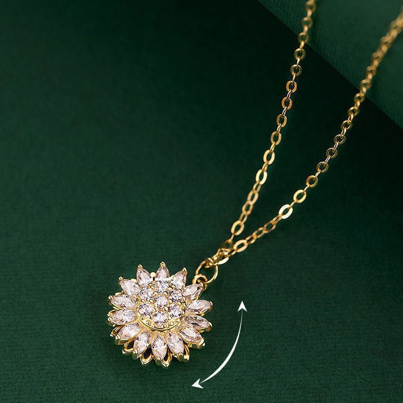 El Collar GiroSol incorpora un innovador mecanismo giratorio que permite que el colgante de girasol rote suavemente con el movimiento natural del cuerpo. Su diseño de doble capa permite que la parte central del girasol gire independientemente mientras la base permanece estable, creando un efecto visual único que atrae miradas y genera conversaciones. Los cristales de circonita estratégicamente colocados capturan y reflejan la luz con cada giro, amplificando su brillo y destacando los detalles del girasol.
