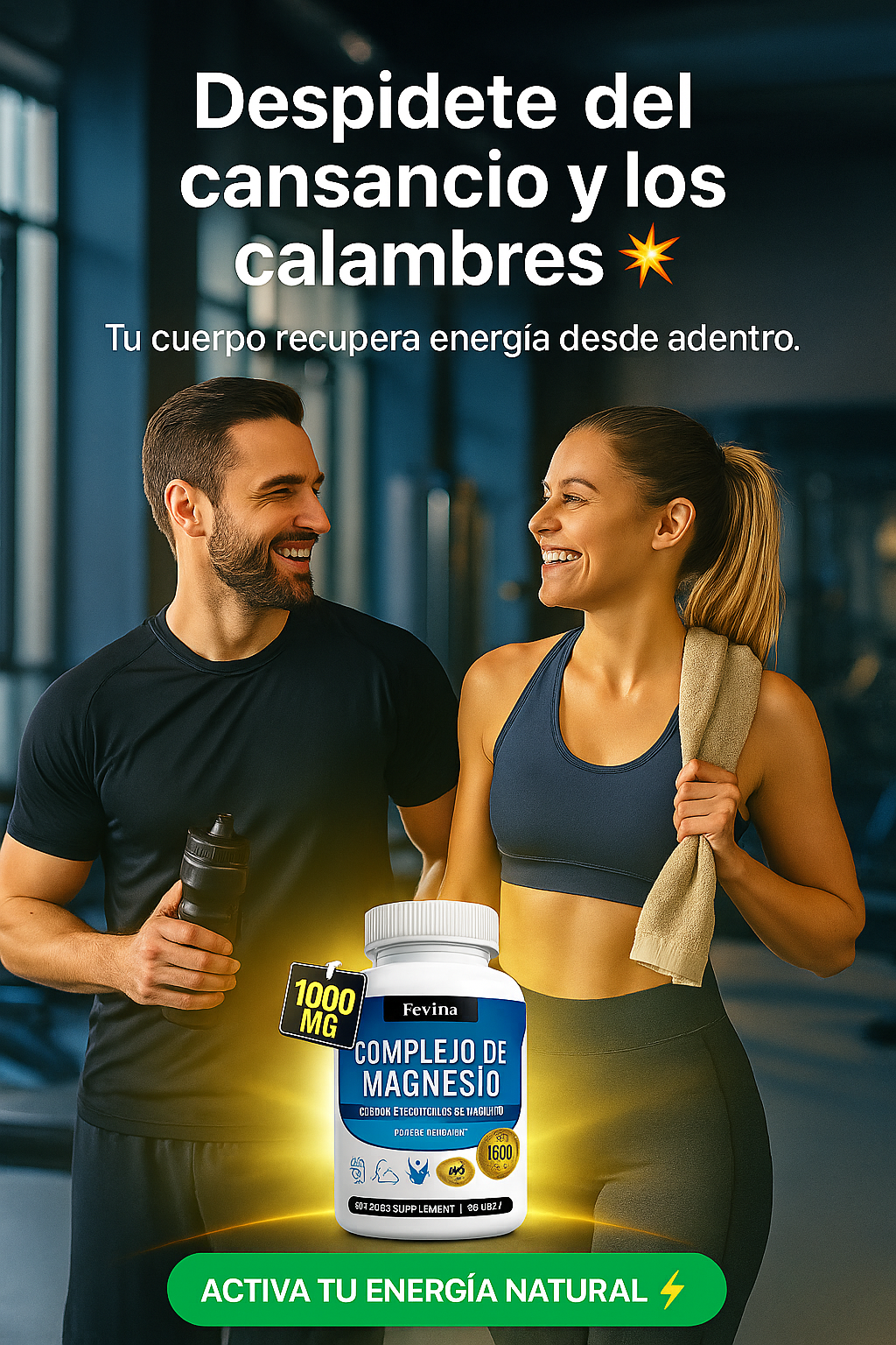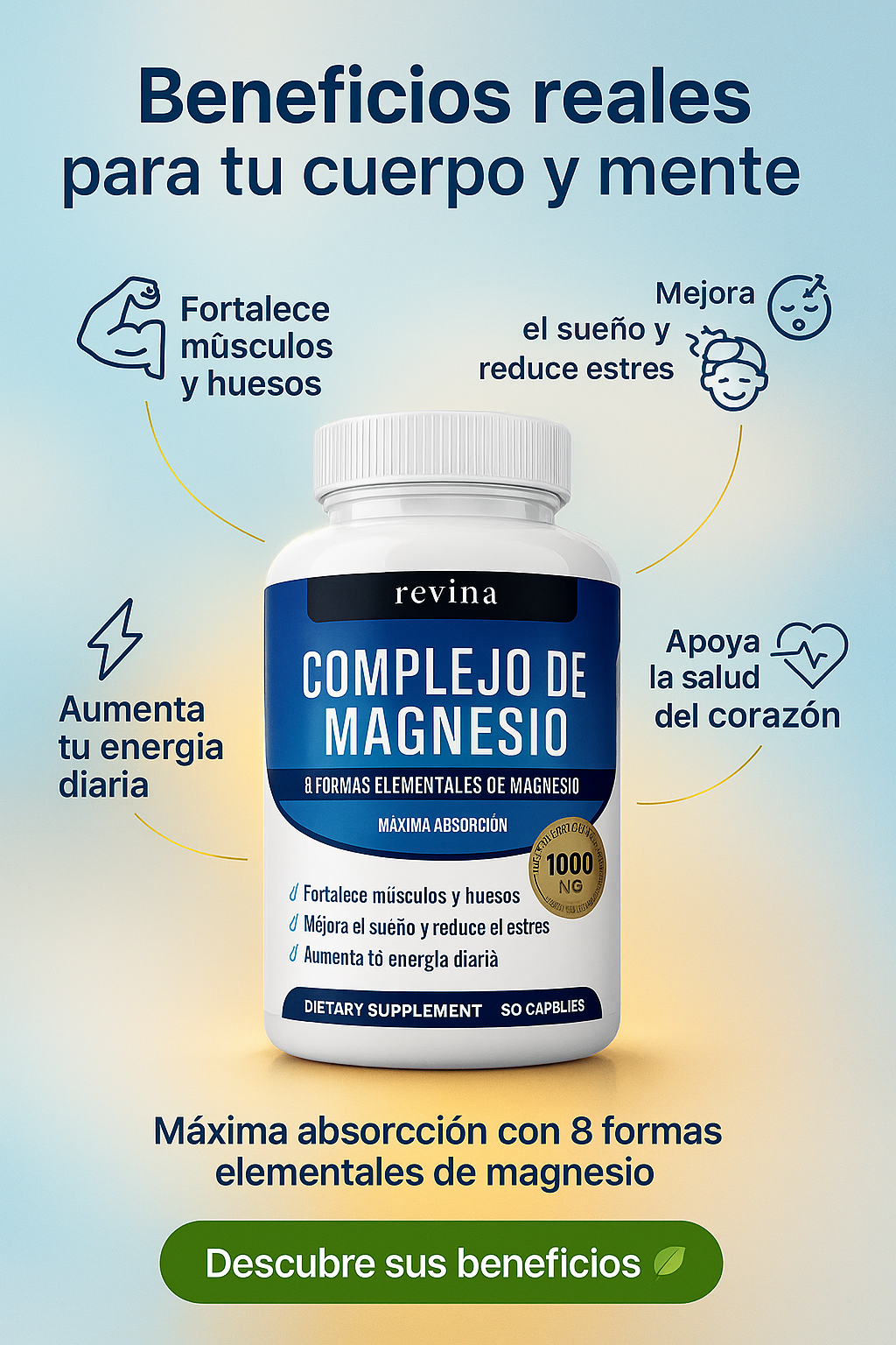 El magnesio es esencial para que los músculos se relajen correctamente después de contraerse. Cuando falta magnesio, aparecen espasmos, tirones y calambres en piernas, espalda, cuello, manos o pies. Revina —con su mezcla de 8 formas elementales— ayuda a mantener el equilibrio muscular y evitar esa rigidez que sientes después de estar sentado mucho tiempo, entrenar o simplemente caminar todo el día.
